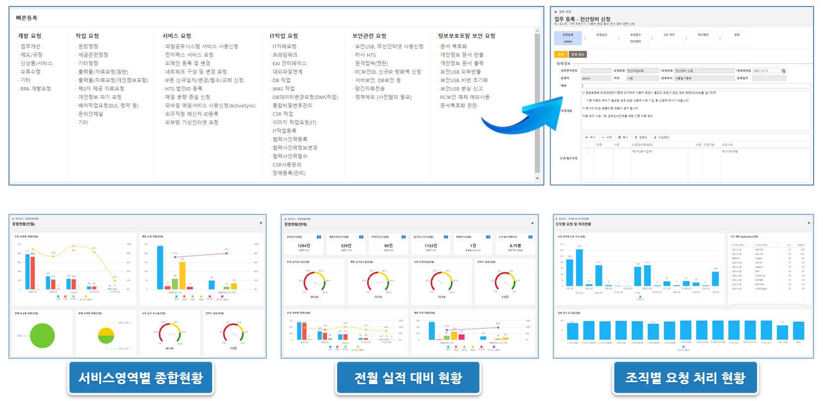 ITSM / 형상관리 / 프로젝트 관리 등 관리 분야별로 통합된 정보를 한눈에 파악하도록 합니다.