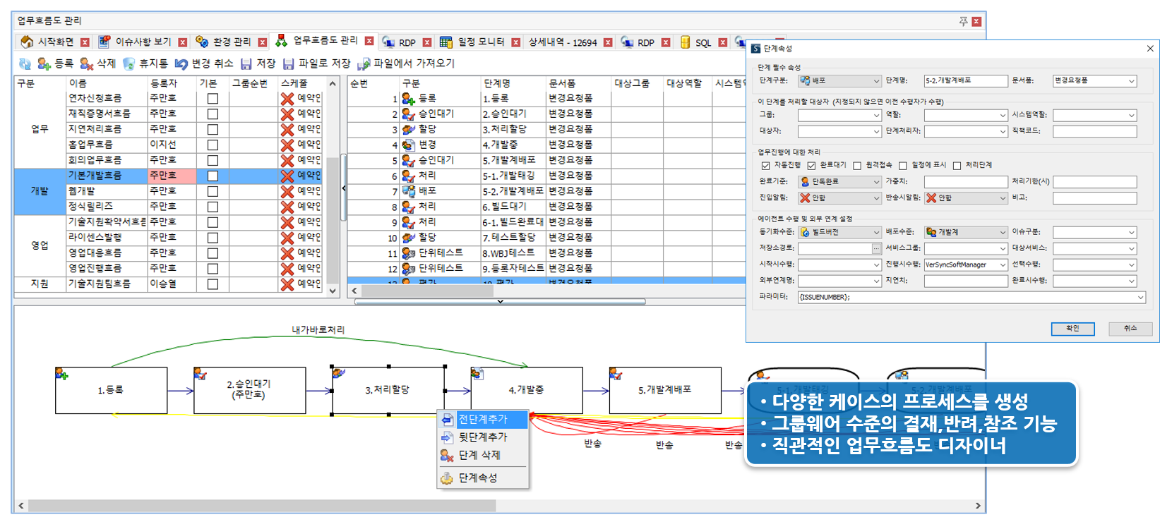 다양한 IT 개발 운영 관리 프로세스 구성을 위한 업무 흐름도 디자인 기능을 제공합니다.