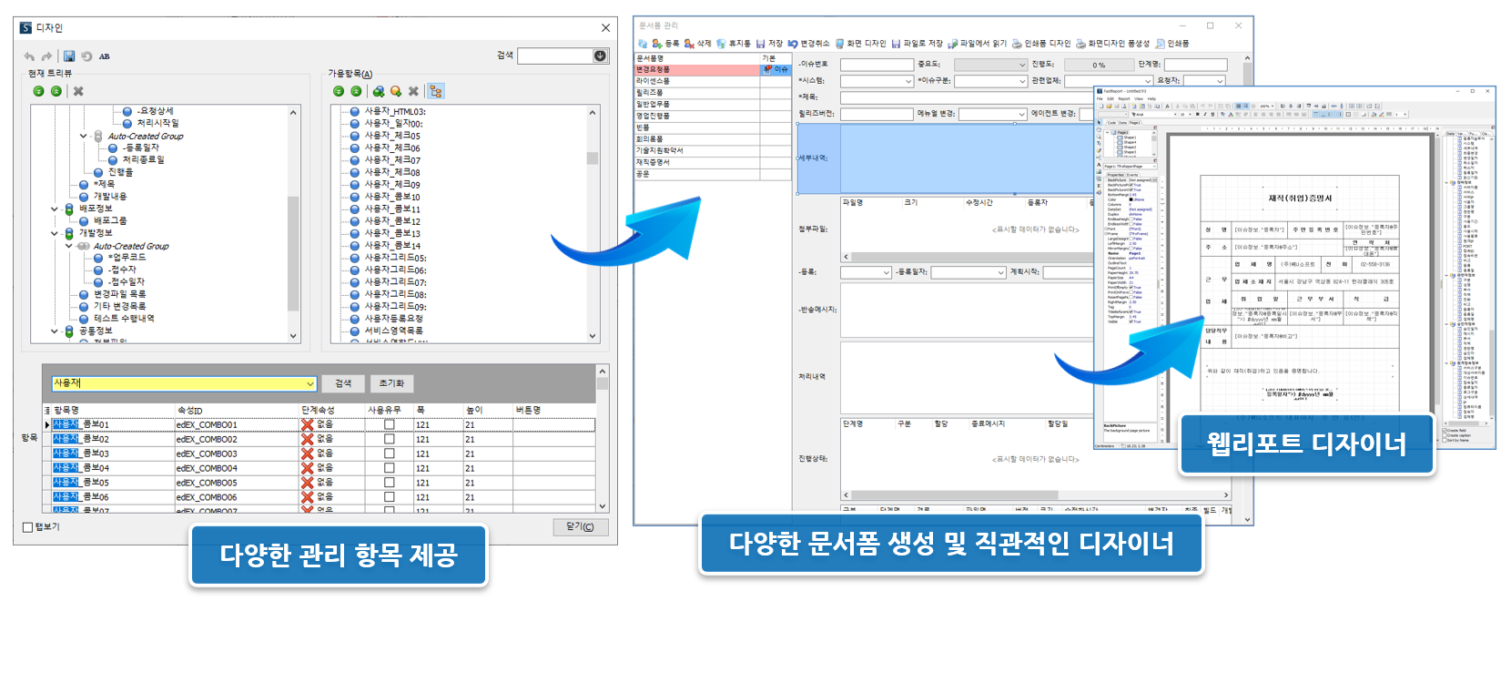 IT 통합 관리를 위한 다양한 업무폼을 양식을 디자인 하는 기능으로 SoftManager 로 구축한 모든 프로젝트에서 사용된 모든 관리 항목들이 포함되어 있으며 사용자가 자유자제로 디자인 하도록 구성 되어 있습니다.