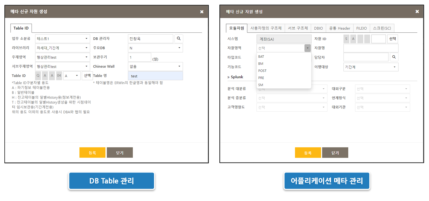 시스템에서 사용될 수 있는 용어 / 단어 관리와 DB 테이블 영역 관리 뿐 아니라 상세 어플리케이션 객체 메타까지 지원하는 메타관리 기능을 제공 합니다.