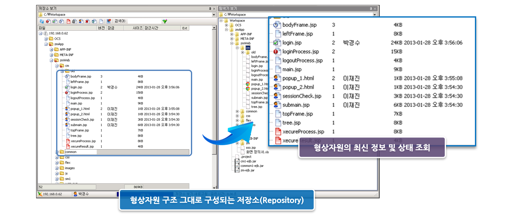 SoftManager의 저장소(Repository) 보기 기능은 개발 소스 및 산출물 들을 체계적으로 버전관리 해주며, 보통의 버전관리 도구에서 제공되는 최종버전 받기 , 체크인 , 머지 , 베이스라인 뿐 아니라 실시간 변경 자원 알림으로 동시 개발을좀 더 수월하게 해주며, 4G 이상의 파일도 관리 가능하며 15년 이상 검증된 Native 엔진 기반으로 대용량, 고성능을 실현 하였습니다. 또한 소스 유출 사고 방지를 위한 보안 기능도 추가적으로 제공 합니다.