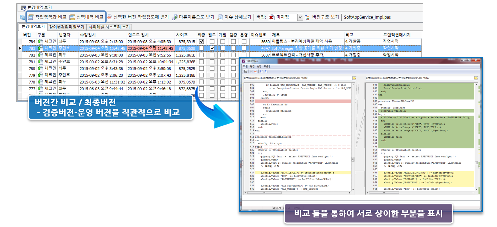 변경내역보기에서 버전 별 직관적으로 최종버전 / 빌드버전 / 개발버전 / 검증버전 / 운영버전을 쉽게 비교 할 수 있어 내가 개발하고 있는 소스와 운영에 반영된 소스의 차이점을 즉시 비교 할 수 있습니다.