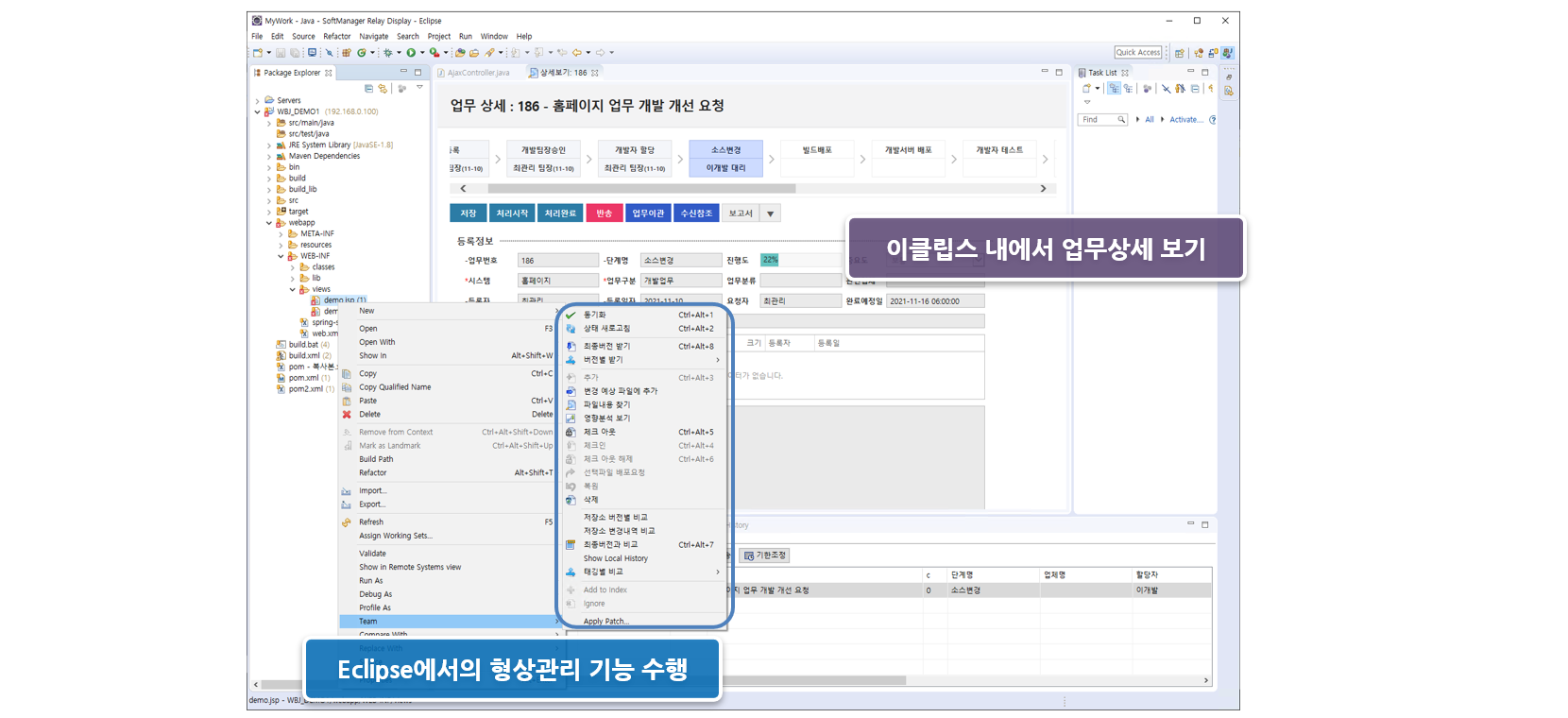 Check In/Check Out 뿐만 아니라 요청(이슈)관리까지, 개발자들이 사용하는데 불편함이 없도록 Eclipse와 연동 편의성을 지속적으로 개선해 나가고 있습니다.