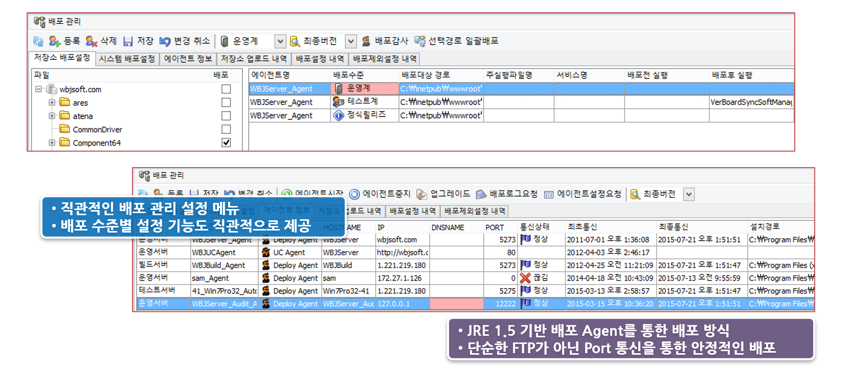 원격지에 있는 다수의 지정 서버에 직렬 , 병렬 배포 기능을 제공 합니다. 전용 배포 Agent는 다양한 OS에 배포를 지원하며, 업무 흐름도와 연계하여 즉시 배포, 승인 배포, 승인 후 스케줄링 배포 뿐만 아니라 단계 별 서버 배포 (테스트서버 -> 운영 서버) 등 다양한 배포 환경을 구성 할 수 있습니다.
