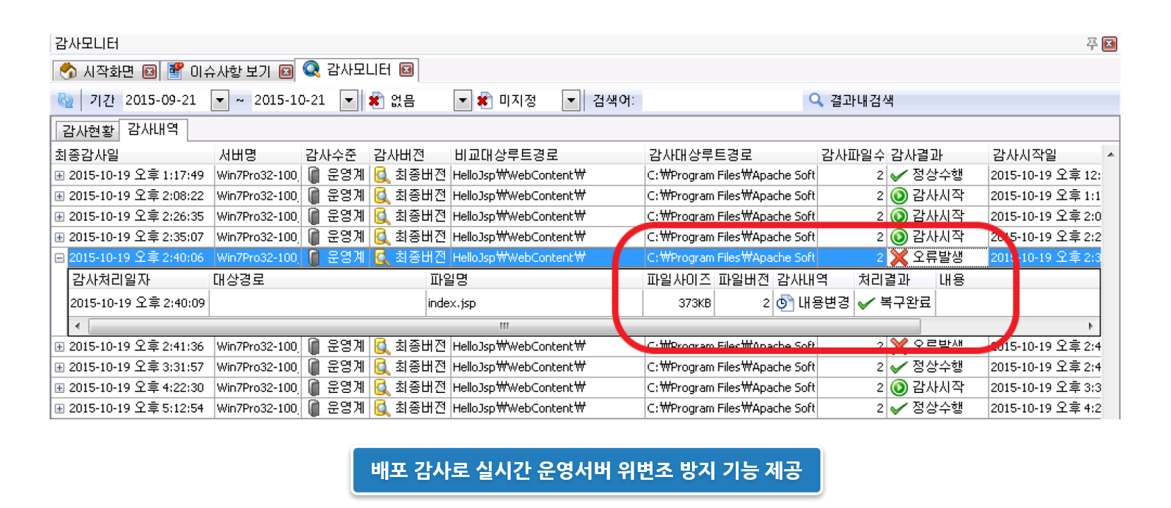 배포 감사 기능을 통해 운영서버에 SoftManager를 통하지 않고 직접 접속해서 소스를 변경하거나 해커나 비인가 접근자가 운영서버의 소스를 변경 시에 즉각적으로 원래 승인 받은 소스로 복원시켜 주며, 임의 변경 리스트를 관리자에게알려주는 기능을 제공합니다.