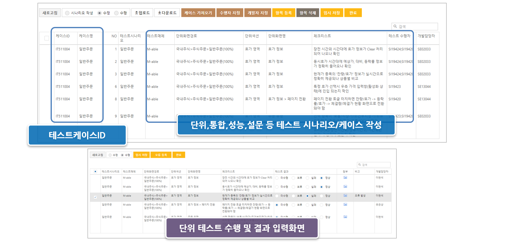 형상자원의 변경과 관련하여 단위 테스트/통합 테스트로 구분된 테스트 시나리오 및 테스트 케이스(CASE)의 관리기능을 제공합니다.