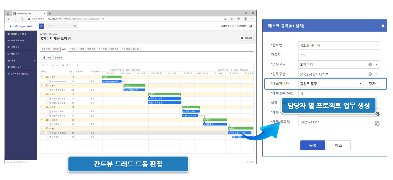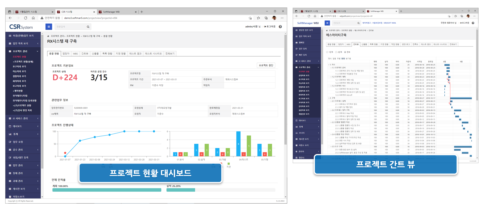 SoftManager 프로젝트 관리 기능은 요청(이슈)관리 기능과 연결 되어 담당자가 업무를 진행하면, 실시간 진척 관리 기능을 제공합니다.