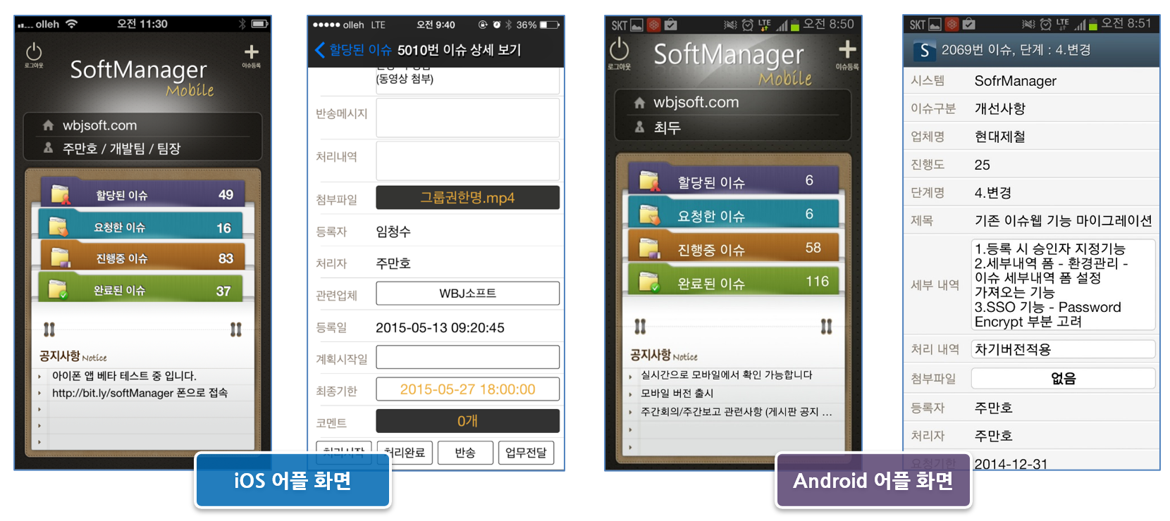 Android 와 iOS 기반의 스마트폰에서 사용 가능한 SoftManager 모바일 앱은 이슈(요청) 등록에서 부터 이슈 상세 내용 확인 및 승인 반송 등의 프로세스 처리 그리고 프로세스 알림 설정에 따라 실시간 알림을 받을 수 있는 모바일 앱을 제공합니다.